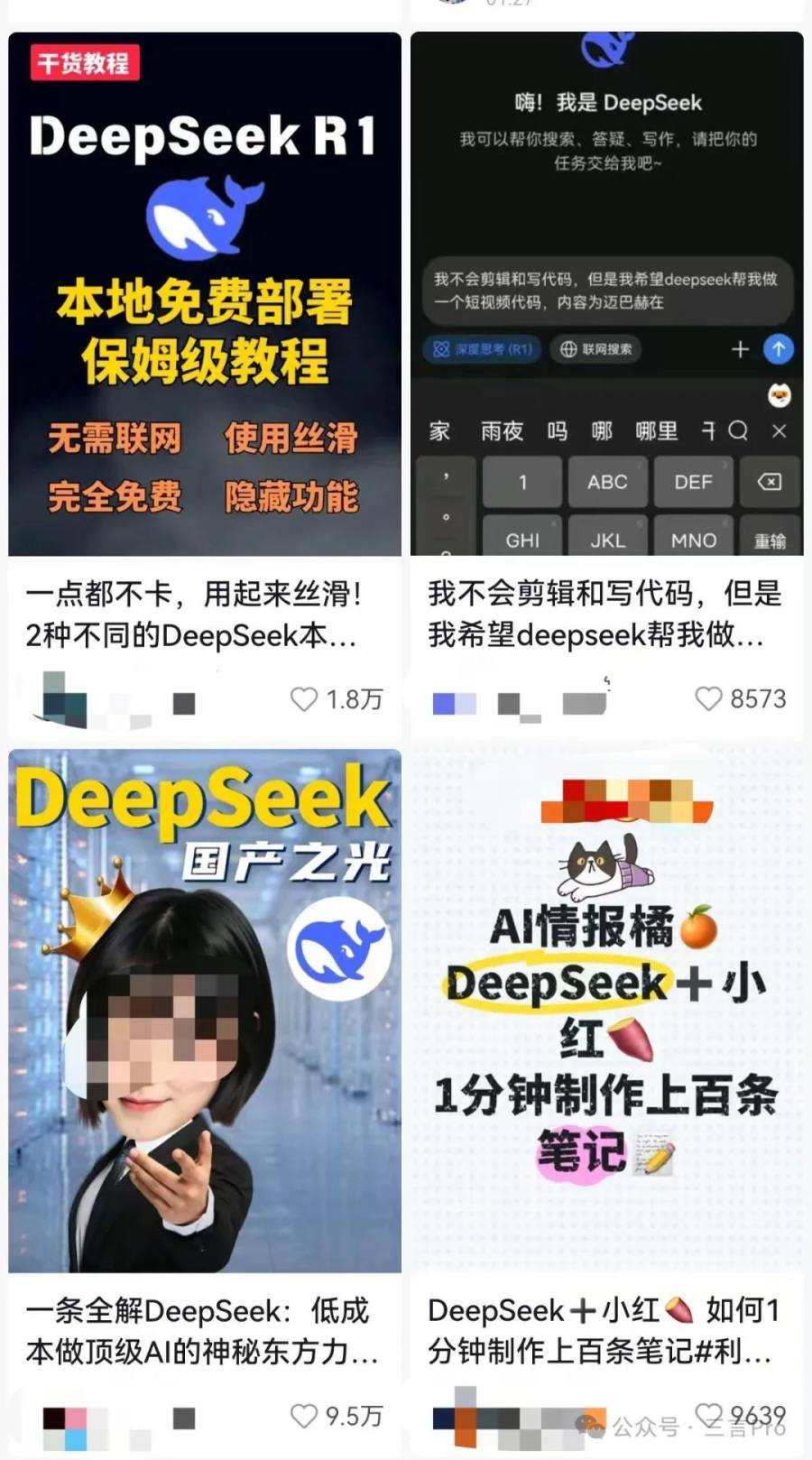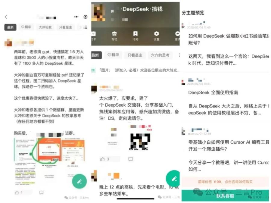 一方面他们刻意制造焦虑,让人们担心自己跟不上时代从而错过机会;另一方面也是利用部份人的“贪婪心”,画一张能够一夜暴富的大饼,实则准备割韭菜。当然了,这种课程并不是全都是为了“割韭菜”而生,因此要学会甄别“割韭菜课程”。那些打着“助你日进斗金”的教程,十有八九都是“大忽悠”。比如上面几篇文章中所谓的“赚钱赛道”,其实本质上压根没有证明DeepSeek的模型能够赚钱,仅仅只是告诉读者一种工具的使用方法,而这种工具怎么赚钱其实一点都没说。拿几篇文章中都提到的利用DeepSeek代写文案做自媒体赚钱的模式举例,运营图文自媒体还是短视频自媒体是否能够赚钱,文案内容确实重要,但是由DeepSeek创作的文案是否一定赚钱并不一定。DeepSeek的模型只是帮助人类提高生产力,本质上它还是工具而已。所以宣传DeepSeek在各种赛道上“无脑赚钱”基本都是“割韭菜”。但另一方面,在一些知识付费平台上,一些付费圈子也确实传播相关行业知识。笔者在某平台上花费99元加入了一个讨论AIGC内容的圈子,虽然这名博主也会分享一些“小白级别”的DeepSeek使用教程,但也会分享很多专业性较强的AI知识。如果只是想了解一些基础使用方式,比如如何向AI提问、提示词怎么写,这类问题压根不需要花钱买课去学;可以看些免费的教程,甚至可以直接询问DeepSeek,大模型自己也会告知答案。但如果需要进行一些专业性较强的操作,例如涉及到编写程序等,那么则可以通过买课进行深度学习。最近《DeepSeek从入门到精通》的pdf已经在社群流传,如果不是因为春节假期,一些行动力强的人早就出书了。出版社马上上班了,相信有关DeepSeek的各种书籍会涌现出来。