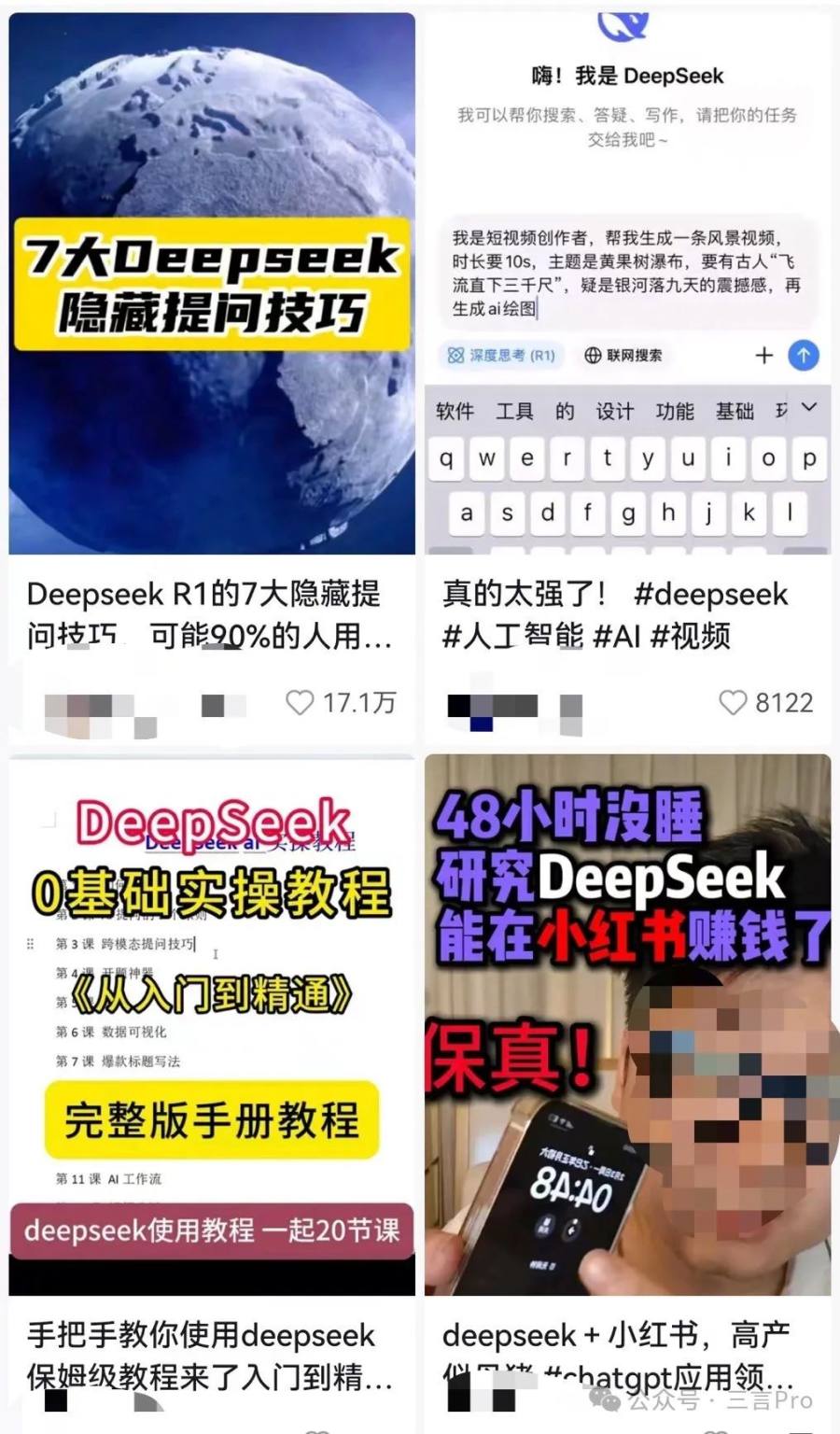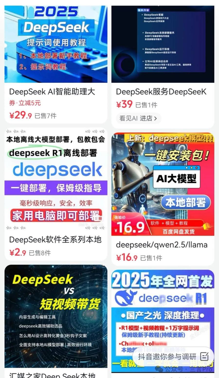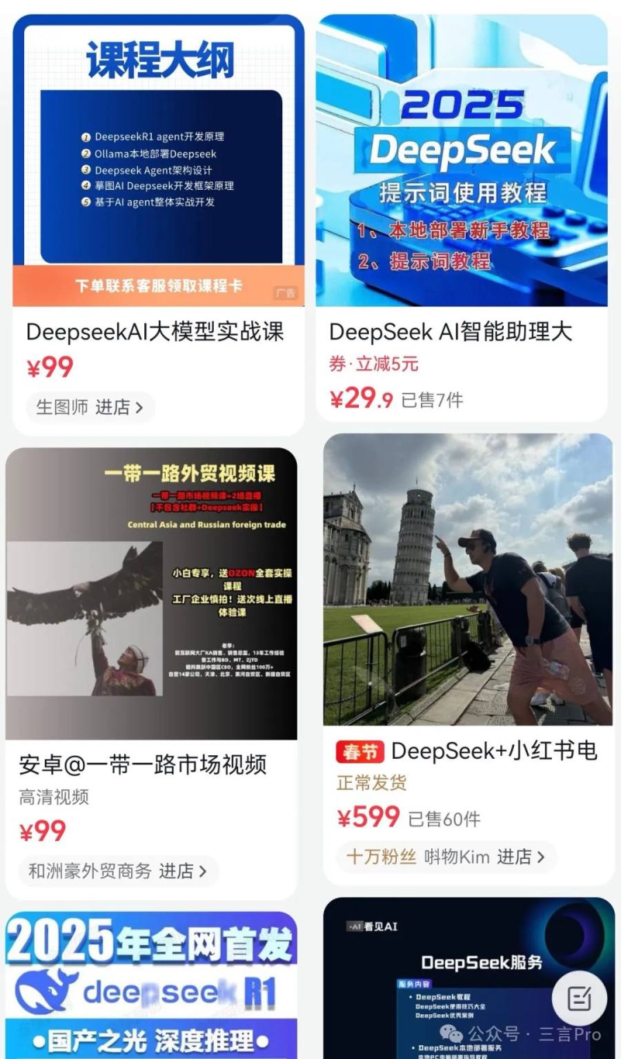 DeepSeek爆火后,教你怎么靠它年入百万的各种课程随之而来。这两天,三言注意到在社交平台、电商以及一些知识付费平台上,出现很多打着“利用DeepSeek赚钱”名号的课程,还有一些挂着各种教授、行业专家名号的人开直播专门讲授DeepSeek知识。那么,这些课程是否如其需宣传的那样,真能让每个人随便成为百万富翁吗?各式各样的课程充斥平台