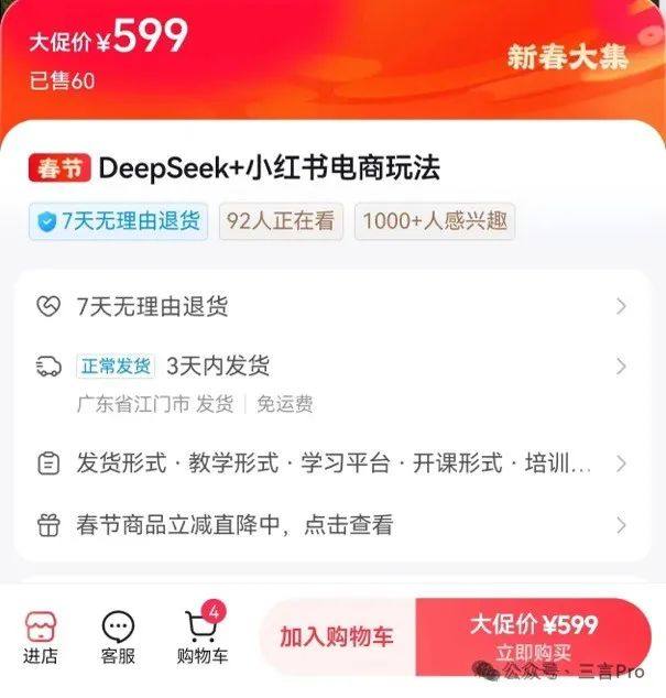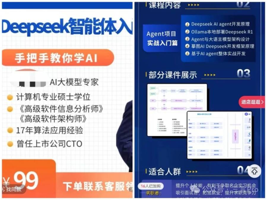 在各社交平台,随便就能刷到各种各样的DeepSeek使用课程。这类课程视频,有免费分享如何操作、使用DeepSeek的;也有需要付费购买的线上课程,平均售价绝大部分在30元左右,也有少数课程价格高达近600元。笔者简单浏览了下上面的教学课程,大部分内容都围绕着DeepSeek操作教学,包括如何注册、如何输入提示词、使用技巧;例如这个名为“DeepSeek大模型实战课+智能体人工智能程序员快速入门课”的课程,宣传是由一位计算机专业硕士、曾担任上市公司CTO的AI大模型专家讲授。课程售价99元,主要讲授DeepSeek AI agent开发原理、本地部署等内容。还有一门名为“DeepSeek+小红书电商玩法”的课,售价高达599元。不过,商品描述中却显示这门课针对的是利用DeepSeek做海外电商的,包括“美国版小红书”如何注册、如何利用DeepSeek做数字人、或者文案创作。除了直接提供DeepSeek教学、技巧分享的视频、线上课程内容外,很多荐股博主也在利用DeepSeek宣传。笔者就刷到不少直播间,看上去像是在介绍DeepSeek模型,实际上是分析其爆火后对相关股票价格影响,类似分析“DeepSeek概念股”。他们会引导网友点右下角领取福利(概念股相关资料),有的需要付钱以及加平台外的联系方式。