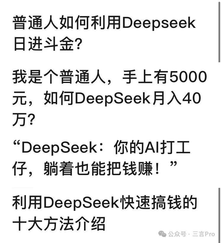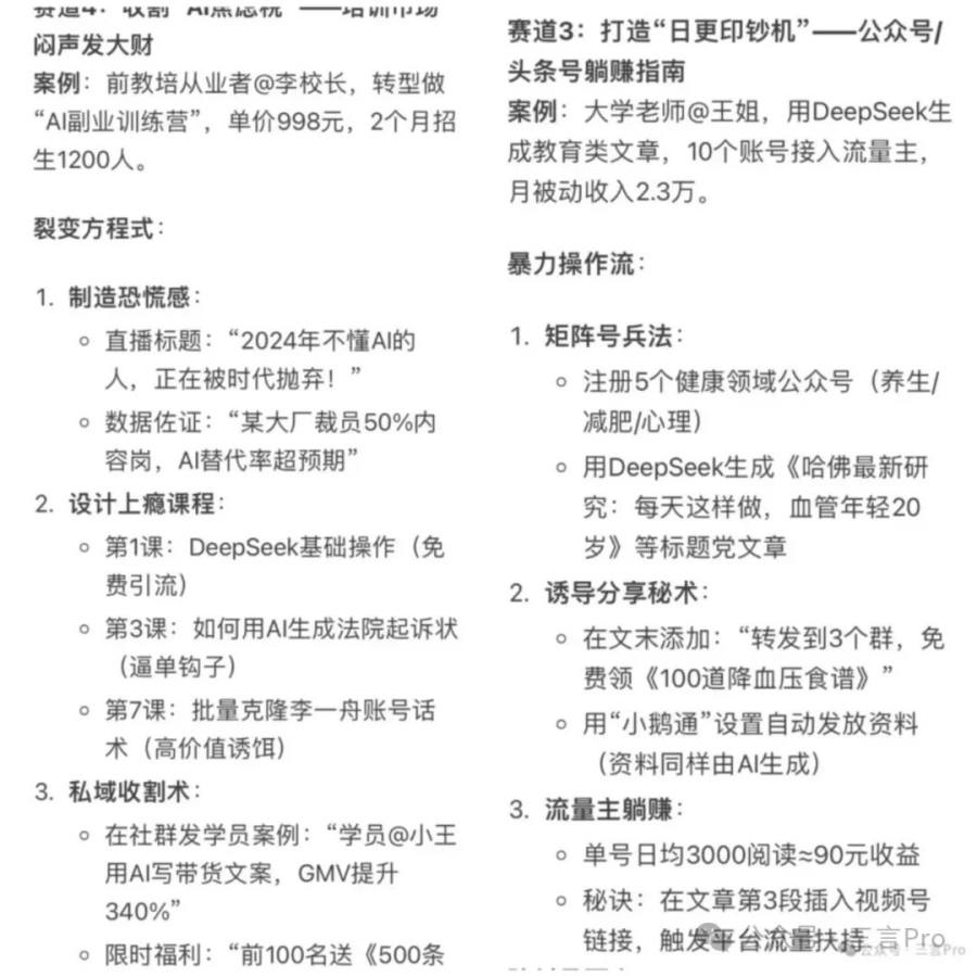 这些宣传DeepSeek能够助人日进斗金的内容,是不是骗子呢?在题为《普通人如何利用Deepseek日进斗金?》的文章中,介绍了“5大赛道”:1 利用DeepSeek批量制造“职场逆袭”剧本,做短剧视频;2 利用DeepSeek日产100篇推文,做公众号运营;3 用DeepSeek生成特定类别文章,运营公众号;5 做“AI工具二道贩子”,搭建DeepSeek镜像站,按次付费先不说这5个赛道含金量多高,光第四条就着实令笔者“绷不住”。这篇文章更是直言不讳的要大家去刻意制造焦虑,以此卖课;还有竟然教大家用DeepSeek生成各种标题党文章,然后诱导读者分享换取流量,甚至还“贴心”的给出了防封号办法。再来看一篇《“DeepSeek:你的AI打工仔,躺着也能把钱赚!”》文章,看看怎么躺着挣钱。这篇文章把DeepSeek形容成“AI印钞机”,然后给出了三个“躺赚模式”。一、利用DeepSeek代写文案,然后给客户提供代写服务;二、做知识付费博主,利用DeepSeek生成课程大纲、讲义,然后卖课;三、自媒体运营,利用DeepSeek生成文章标题、内容,做自媒体。本质上为了引流到私域