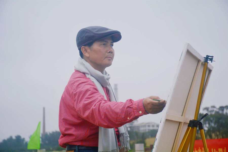 在现场,冯才权还面对春意盎然、红绿相映、碧水蓝天的“菠萝的海”进行丙烯画写生,给喜气洋洋而来游玩的客人,带来了移景入画的审美愉悦。
