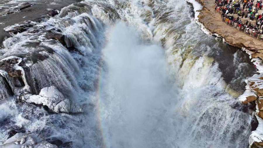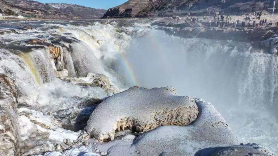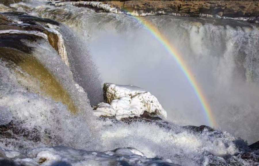 近日,受陕西区域持续降温天气影响,位于秦晋大峡谷的陕西壶口瀑布景区出现冰瀑玉壶景观。从空中俯瞰,滔滔黄河水奔腾咆哮,场面蔚为壮观,飞溅起的浪花和弥漫的水雾在两岸岩石和护栏上迅速凝结,形成形状各异的冰挂,晶莹剔透,美不胜收,飞瀑上空偶现的彩虹与冰挂同框,交相辉映。