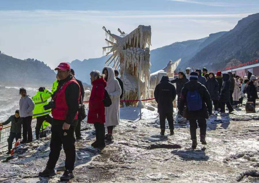 据了解,由于近期黄河水流量上涨,达到700立方米每秒,该景区主侧瀑布携手倾泻,现“90版50元人民币”取景壮美瀑布景观,游客一次旅程可享双瀑齐观。这一壮美的景观吸引众多游客驻足拍照。据介绍,这个造型是景区依托瀑布流势搭建的结构,瀑布溅起的水雾在龙形结构上凝结成冰,因此形成了这个令人震撼的景观。