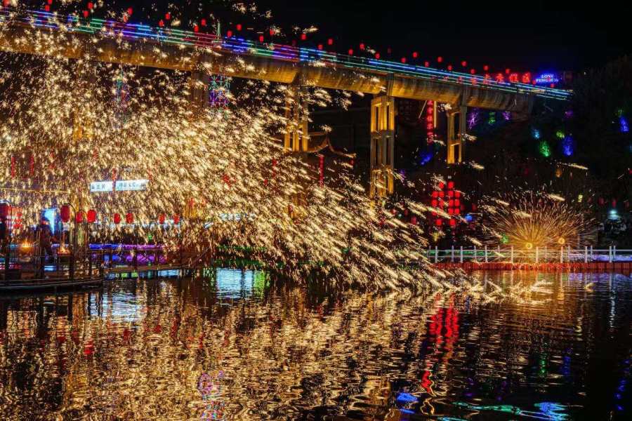 “东风夜放花千树,更吹落,星如雨。” 古镇如意湖上,非遗匠人整装上阵,一勺滚烫铁水泼向夜空之中,1600℃的金色流星雨倾泻而下,在夜空中炸裂成漫天火树。这一刻,盛唐上元夜的风仿佛穿过千年。从大年初八到正月十六,龙凤山古镇热闹不停歇,欢乐不打烊。30余场演绎每天不间断上演,庙舞迎宾、惊空杂技、国潮快闪、小丑互动......