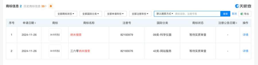 天眼查APP商标信息显示,北京奇虎科技已经申请了三六〇纳米搜索的网站服务类商标。