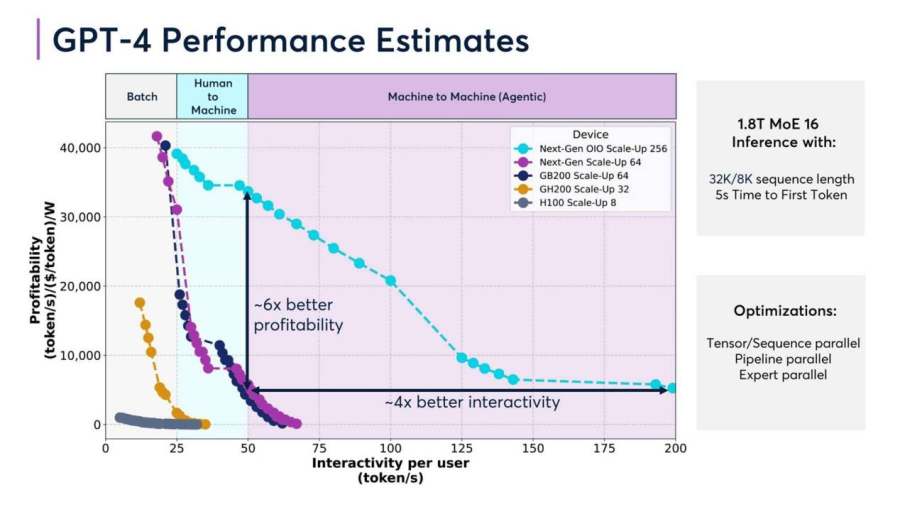 然而,作为算力产业的基石,相同投入下,优质的算力基础设施往往会提供更高的算力效率与商业回报。《2025年算力产业十大趋势》中提到过,以GPT-4为例,不同硬件配置下其性能会发生显著差异。对比H100和GB200等不同硬件配置驱动GPT-4的性能,采用GB200 Scale-Up 64配置的盈利能力是H100 Scale-Up 8配置的6倍。