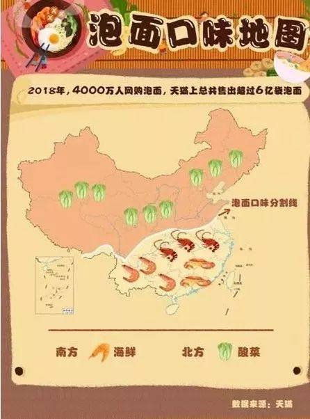 天猫平台曾发布的“泡面口味地图”则显示了南北方消费者在泡面口味上的喜好偏差。