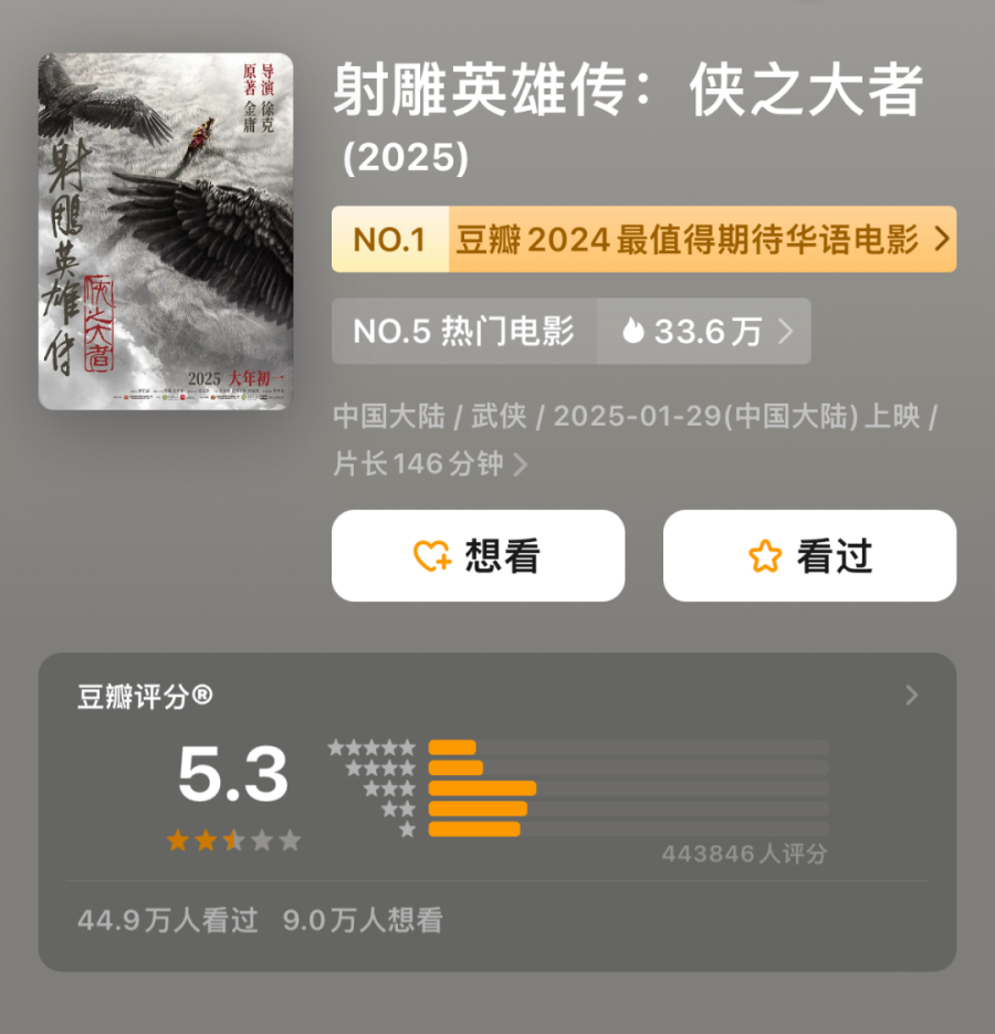 如今在遍地女频的时代,男频剧犹如一支回报高但风险也高的股票。高回报的背后,是对剧本质量和演员表演的极高要求。剧情、人设和演员表演相互影响,一荣俱荣,一损俱损。《射雕英雄传:侠之大者》对原著情节进行了大幅删减和改动,却没有合理的过渡与铺垫。郭靖的性格刻画流于表面,缺乏原著中那种质朴、坚毅且心怀天下的厚重感,无法引起男频观众对角色的情感共鸣。最终,演员也难以依靠电影实现更大范围的出圈。