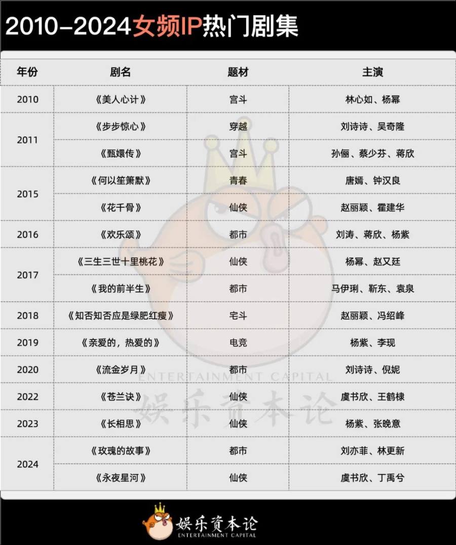此后,两路题材各自发展。2010年前后,网文IP改编为影视行业发展带来新的契机。以《步步惊心》《甄嬛传》为开端,大量女频IP改编剧如雨后春笋般涌现,迅速占据市场高位。这些作品以女性视角为核心,融合了爱情、权谋、成长等多重元素,逐渐成为影视市场的主导力量。此后,女频剧在题材和形式上不断创新,进一步巩固了其市场地位。