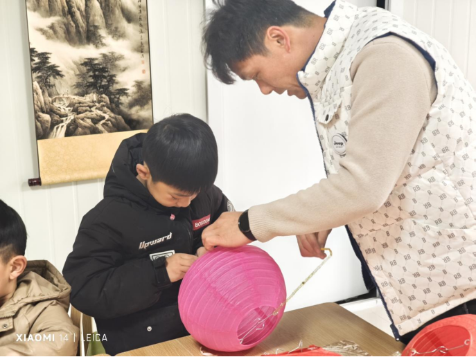 在制作过程中,孩子们兴奋不已,迫不及待地拿起材料动手尝试。家长们则在一旁耐心协助,与孩子一起裁剪彩纸、组装框架。遇到困难时,大家互相交流、共同探讨,现场充满欢声笑语。不一会儿,一盏盏造型各异的灯笼便在亲子间的默契配合下诞生了。