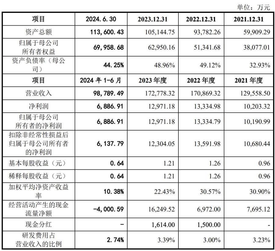 2021年、2022年、2023年度和2024年上半年,丰倍生物的营收分别约为12.96亿元、17.09亿元、17.28亿元和9.88亿元,净利润分别约为1.02亿元、1.33亿元、1.30亿元和6886.91万元,扣非后净利润分别约为1.07亿元、1.36亿元、1.23亿元和6137.79万元。