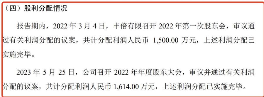 值得一提的是,丰倍生物曾多次进行分红。据招股书披露,丰倍生物分别于2022年6月、2023年5月召开股东大会,审议并通过有关利润分配的议案,分别分配利润1500万元、1614万元。