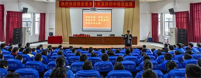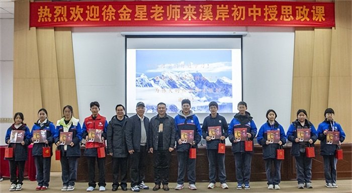 “党课爷爷”徐金星将党的百年奋斗精神配上他自己拍摄的照片,以图文并茂的方式讲解“红船精神”、井冈山精神、苏区精神、长征精神、遵义会议精神、延安精神、西柏坡精神、红岩精神、抗美援朝精神、“两弹一星”精神、特区精神、抗震救灾精神、抗疫精神、脱贫攻坚精神。用党的历史教育学生、启迪学生、感化学生、鼓励学生,激发同学们发自肺腑地感谢党、热爱党的热情。学生们一边聚精会神地听讲,一边认真做好笔记。讲课中有抢答环节,学生们踊跃抢答,答对的学生给予奖励,激励他们的学习热情。