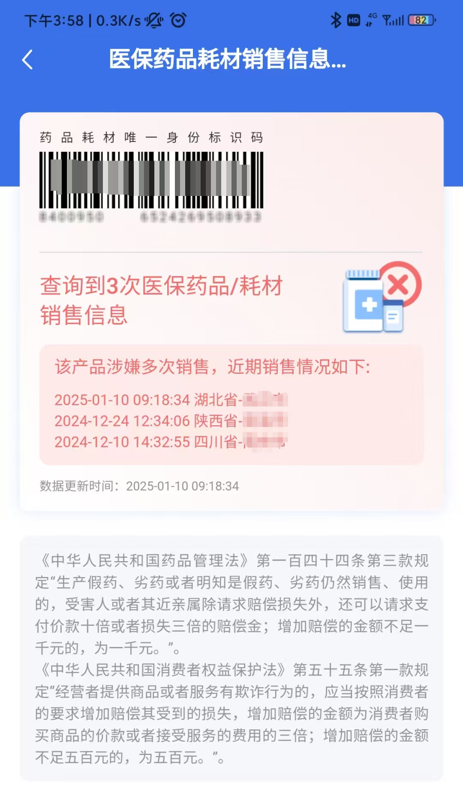 界面如提示“查询到多次医保药品/耗材销售信息”并显示出最近几次的销售记录,该情况说明被查询产品涉嫌多次销售,群众可依据此信息按照《中华人民共和国药品管理法》《中华人民共和国消费者权益保护法》相关条款要求,向销售此药品的定点医药机构索赔。