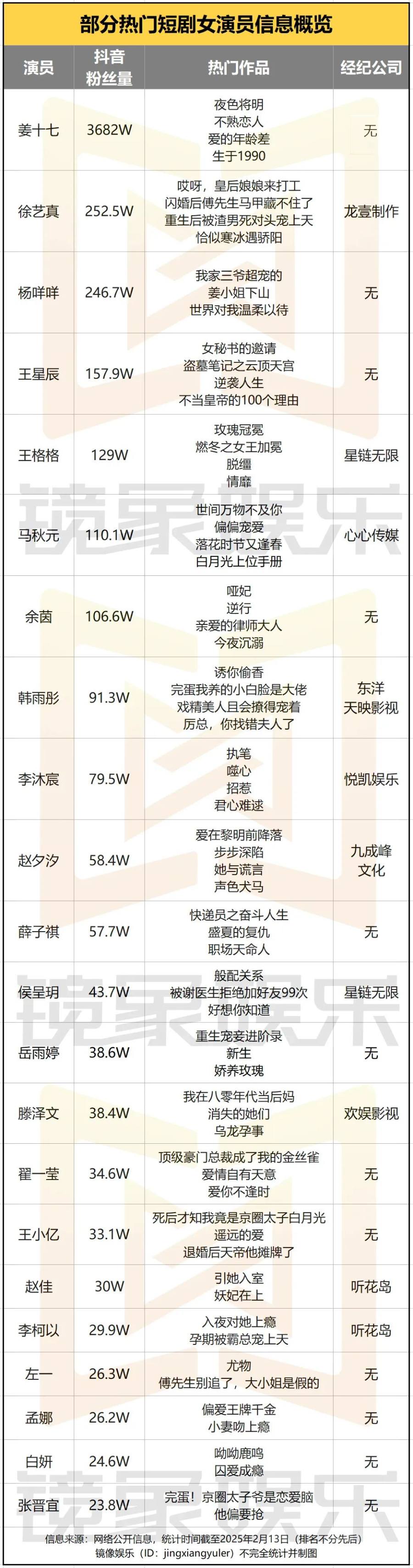 比如行业爆款率极高的短剧公司听花岛,在产出多部热门短剧的同时,其艺人经纪业务也在同步完善,目前,公司已经签约曾辉、王道铁、赵佳等多位短剧演员。基于公司在精品短剧方面的创作实力,公司艺人的整体成长速度更快,比如听花岛旗下的演员曾辉,当前关联的热门短剧内容仅13部,而其抖音粉丝量已落在130万以上,同量级的演员中,何健麒、于龙的关联热剧数量分别为34部和44部。