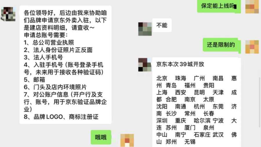 一位京东外卖第三方服务商告诉“财经故事荟”,商家入驻需要提供总公司营业执照、门头及店内环境照片、对公账户信息(用于京东验证品牌企业)、法人身份证和手机号、品牌logo、商标注册证等信息,审核期限为3天。