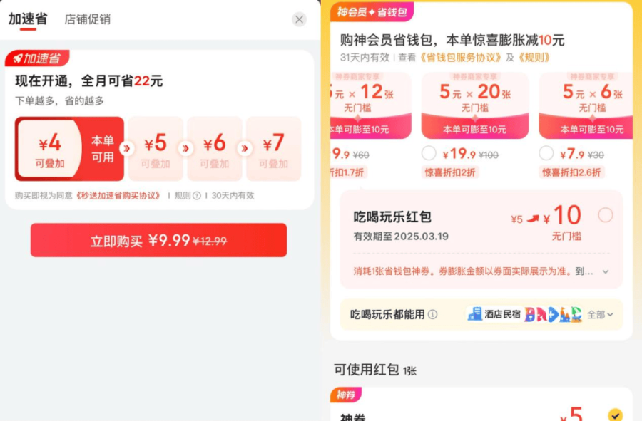 美团则“豪横”很多,仅神会员就分29.9元、21.9元、15元三个档次,分别对应20张、12张、6张无门槛5元代金券,可用于直接抵扣订单总额,每月最少节省30元到100元;此外,美团还会免费赠送用户膨胀专享券、外卖神券,比如满34减4,满28减9.5等,力度明显大于京东。