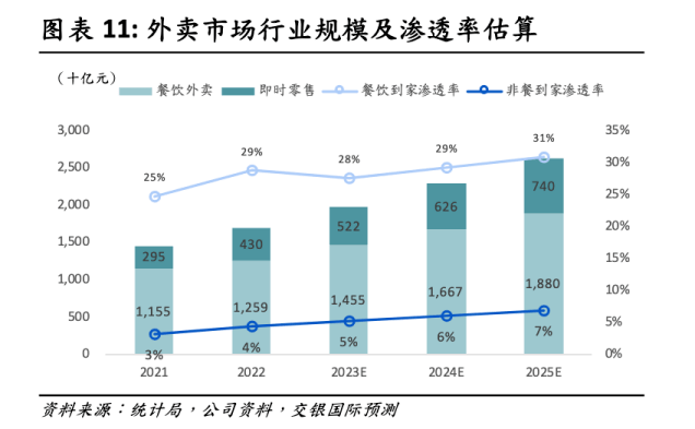 从大盘来看,外卖市场仍有增长空间。据Gangtise预估,2027年中国外卖规模有望从2023年的1.2万亿,提升到1.9万亿元,行业渗透率,有望从2023年的22.6%,提高至30.4%。