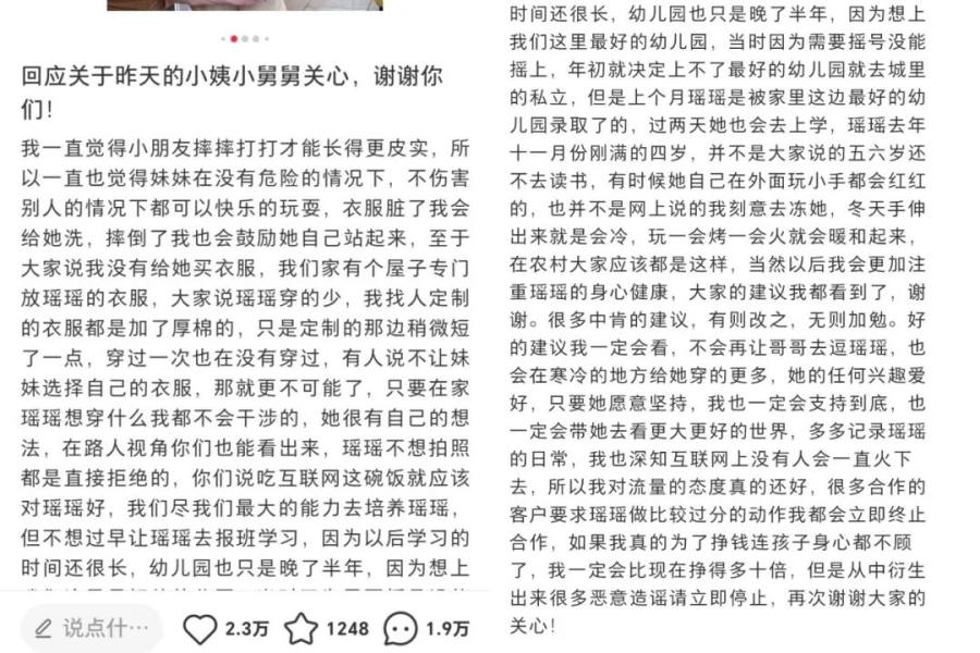 但孩子是否该进入新的生活阶段这点却难以掩盖。瑶一瑶早两年作品中,关于刻意摆拍的质疑声并没有产生较大的舆情,不过随着瑶一瑶已经成长到了4岁,到了在大众意义上已经进入了该上幼儿园的年纪,网友却发现瑶一瑶还在田野之间肆意玩耍。近一年来,在其账号评论区关于“瑶一瑶什么时候上学”的提问也变得多了起来。尽管瑶一瑶爸妈则回应称,是因为周边幼儿园环境不满意,以及对瑶一瑶作为“网红”身份可能会遭受不平等待遇的担忧,打算搬到市区后为其找一所私立幼儿园。但网友们对这一说法似乎并不买账,进一步加深了对其父母意图利用萌娃网红圈钱的质疑。