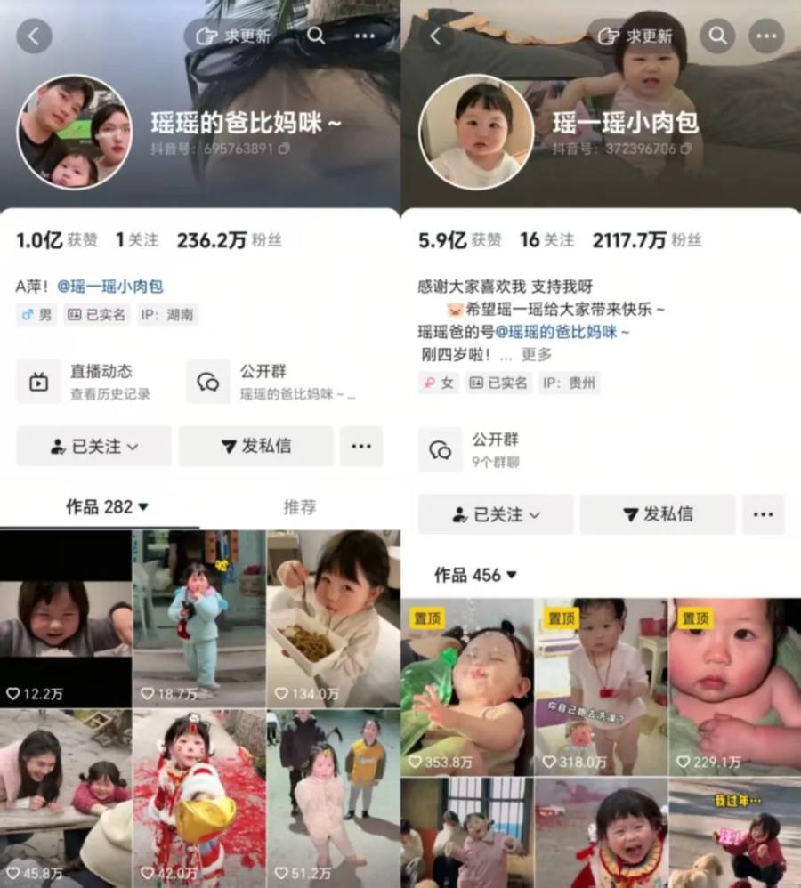 当前,瑶一瑶坐拥两个抖音账号,一个是有2117.9万粉丝的大号“瑶一瑶小肉包”,另外一个是“瑶瑶的爸比妈咪”,粉丝数为236.2万,两则账号的内容都以记录瑶一瑶日常生活为主。“瑶瑶的爸比妈咪”账号偶尔也会分享一些大号拍摄“花絮”以及与父母家人相处日常。