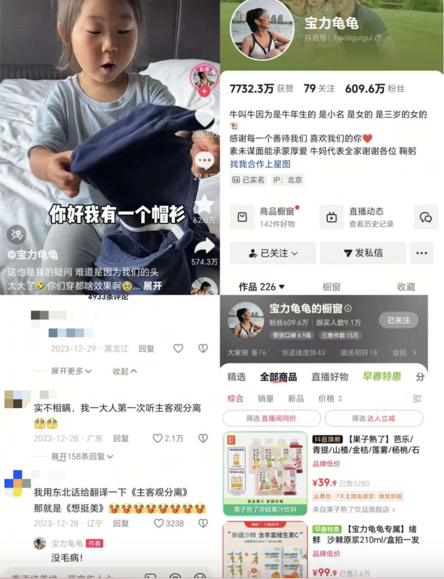 另一类是“天才儿童”系列,例如凭借“我有一个帽衫”火遍全网的三岁萌娃“小牛”,当前其抖音账号“宝力龟龟”已经坐拥609.7万粉丝。年仅三岁却拥有超于同龄人的逻辑思维能力,被不少网友称为“小孩姐”,在“宝力龟龟”视频中,展现出了一个精神抚养下长大的高智商天才儿童,条理清晰且词汇量惊人的回答将其捧上了“互联网导师”的高位,令不少成年人自愧不如。比如,在其一则视频中,小牛在吐槽爸爸的时候甚至提到了“主客观分离”概念,震撼了不少网友。