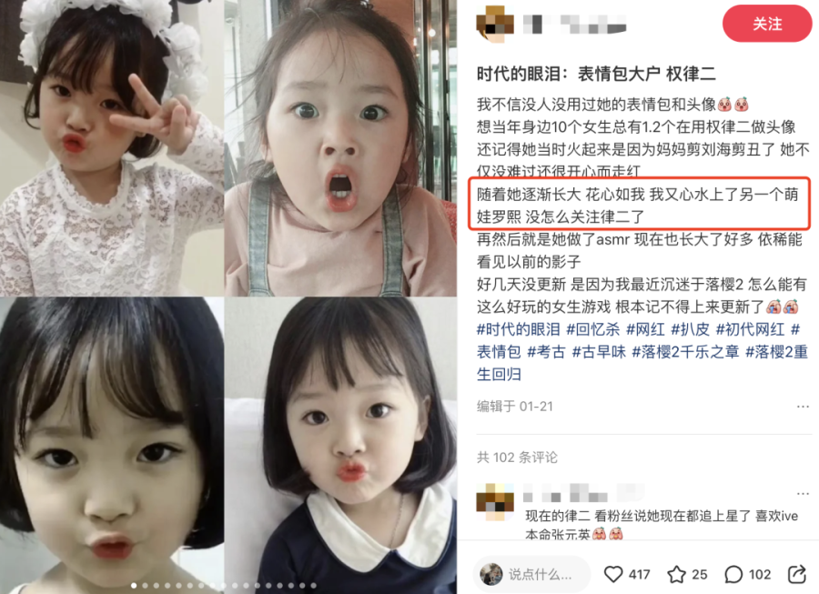 奔着“云养娃”而来的网友们,跟随着互联网女儿的长大和外形变化,很容易“移情别恋”,投奔新欢。网友永远都在寻找“更小更萌”的新面孔。古早萌娃网红哈温、权律二、宋民国等随着年龄的长大,已经被不少人淡忘,甚至被网友嫌弃“长歪了”。