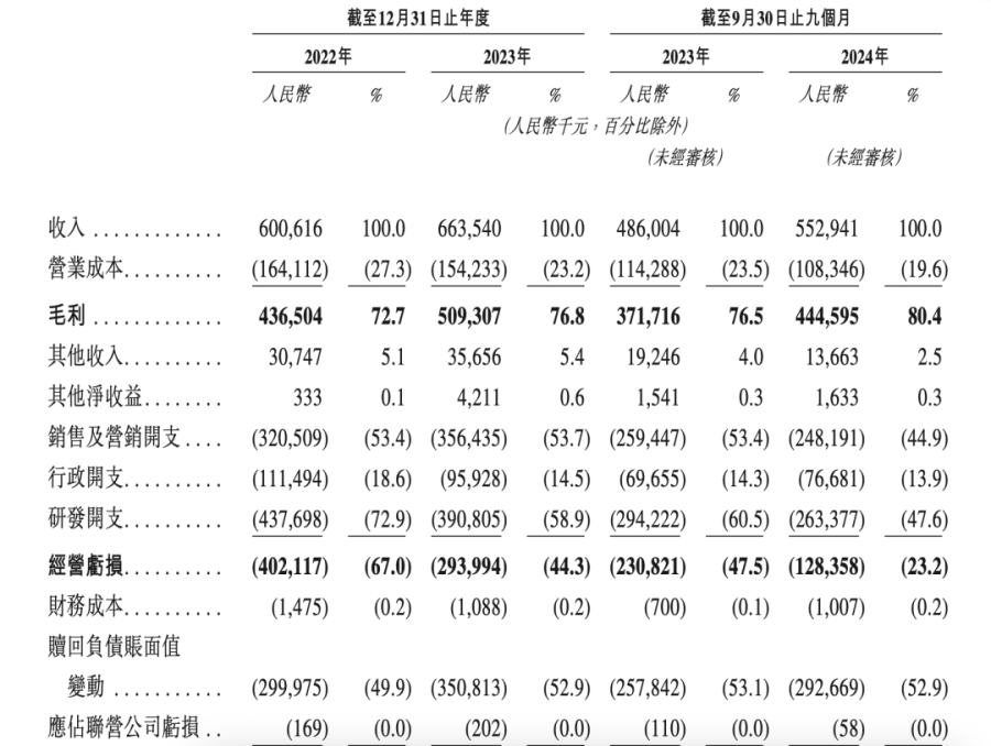 销售及营销开支同期分别是3.21亿元、3.56亿元、2.48亿元,占总收入的53.4%、53.7%、44.9%。也就是说,公司半成的收入都用在了营销上,并且2024年前三季度的销售开支与研发开支接近,重营销轻研发的趋势明显,未来维持持续成长性的能力堪忧。