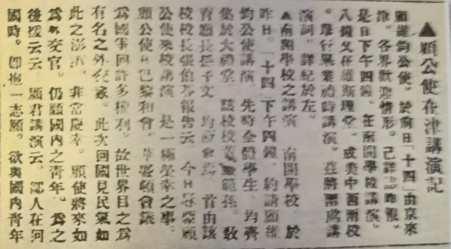1922年6月15日,《大公报》刊登的报道《顾公使在津讲演记》