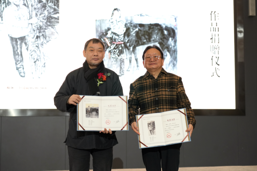 展览画家巫卫东向郑州美术馆捐赠作品,郑州美术馆馆长罗鸣接受捐赠,并颁发收藏证书
