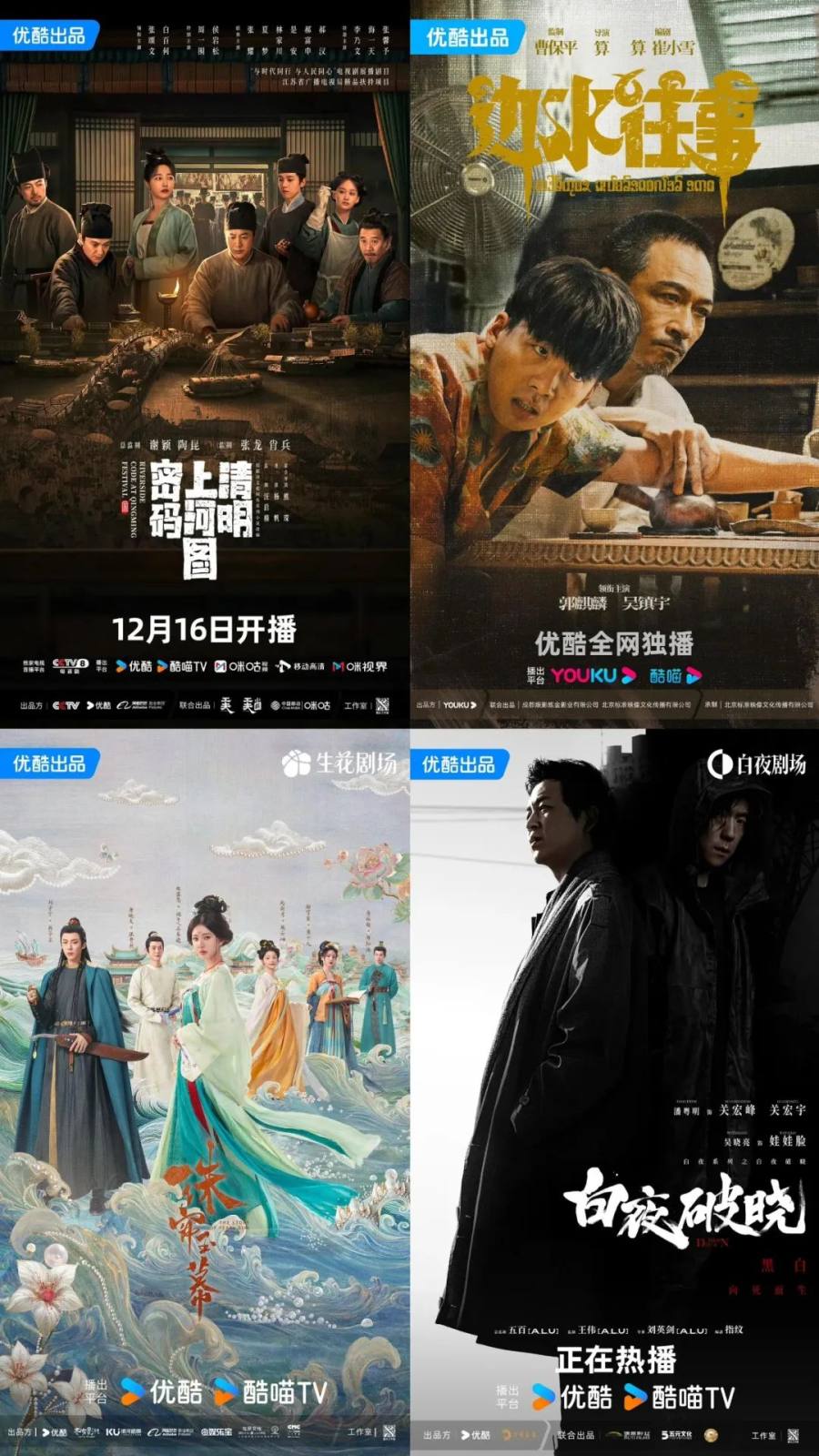 2024年,优酷共有11部破万剧,其中《清明上河图密码》《珠帘玉幕》《边水往事》和《白夜破晓》四部都来自盘古工作室。