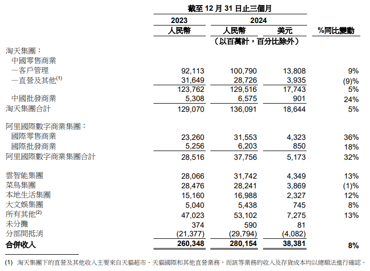 先来说说基本事实:国内电商业务方面,这一季度,淘天集团旗下中国零售商业的客户管理服务收入同比增长9.4%,大幅高于此前5个季度的平均增幅2.2%。阿里巴巴对增长的解释是由于线上GMV和货币化率同比提升所驱动。外界对此的解读基本上都集中于一点:这说明阿里巴巴的核心电商业务,有可能重新进入增长趋势。