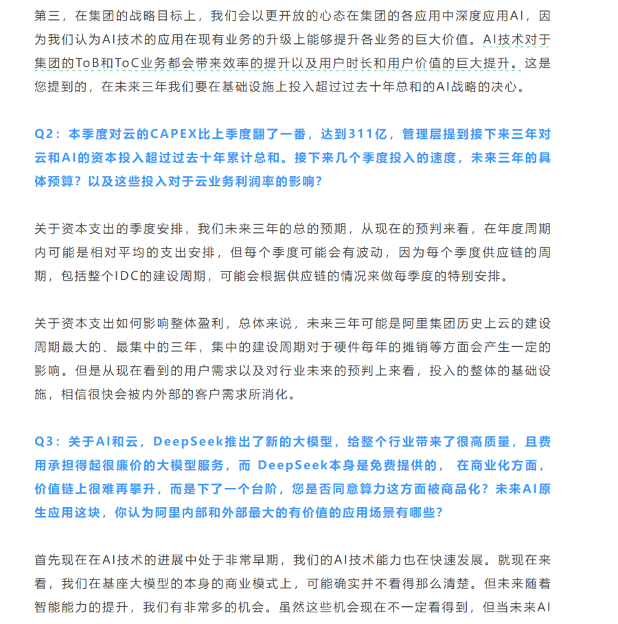 但客观来说,当前阶段性的市场环境,以及阿里的语境有意强调AI上的投入,这让人不得不担忧市场是否有“强行解读”,阿里在未来又是否在落地应用上还有调整空间。技术迭代下,投资者们又会否因为信息差而错判形式、过度亢奋,在目前来看,都是未知数。