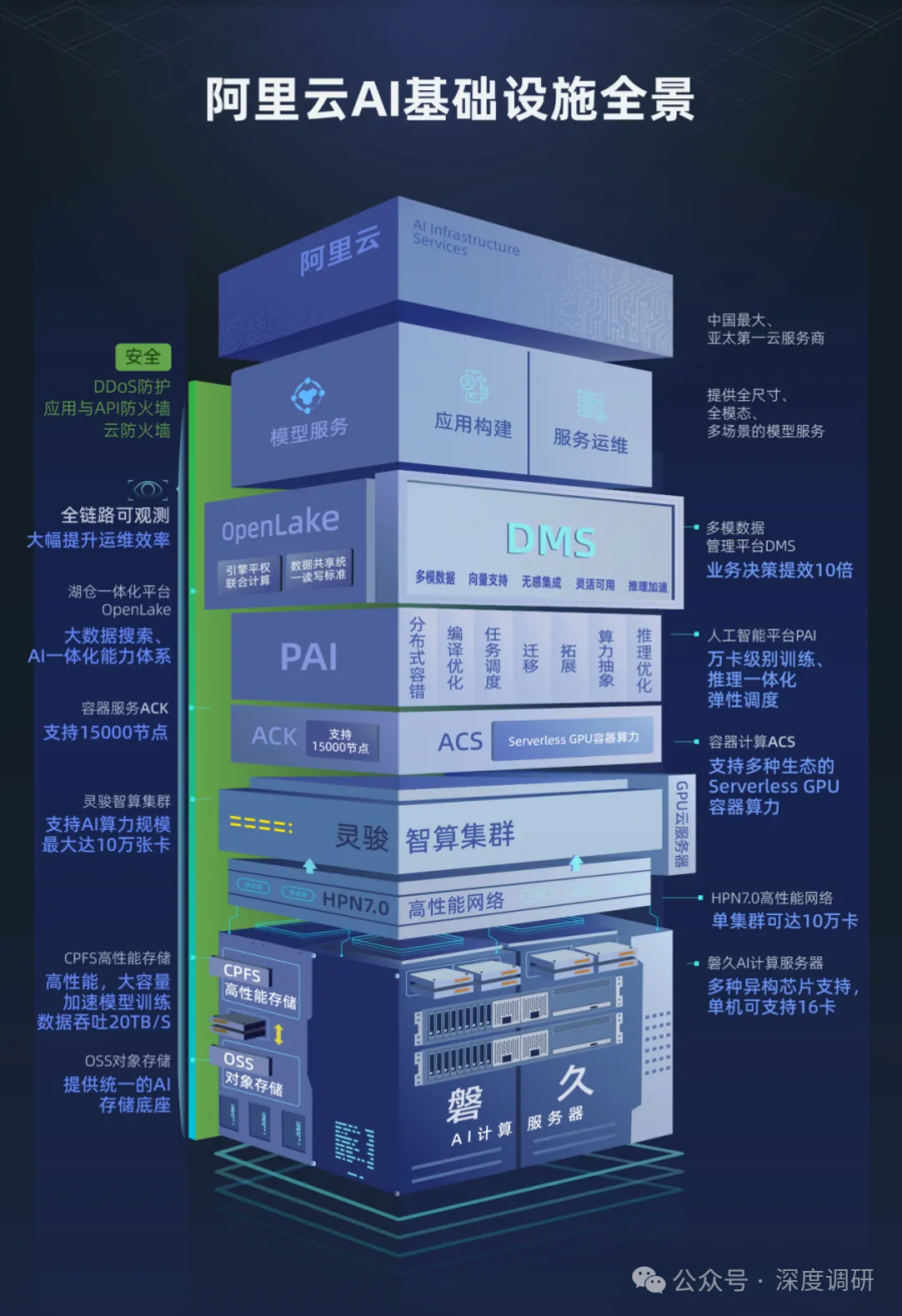 早在2019年,阿里平头哥发布了首款为AI场景深度定制的含光800芯片,该芯片在性能和能效比方面创下当时的世界纪录。2021年,阿里联合清华大学发布了当时业界最大的中文多模态预训练模型M6,参数规模超千亿,具备文本和图像的理解与生成能力。2023年9月,阿里巴巴将“AI驱动”明确为全集团的战略重心,此后,阿里云迅速转向以GPU为主的计算新范式,承接了中国一半以上的AI大模型。