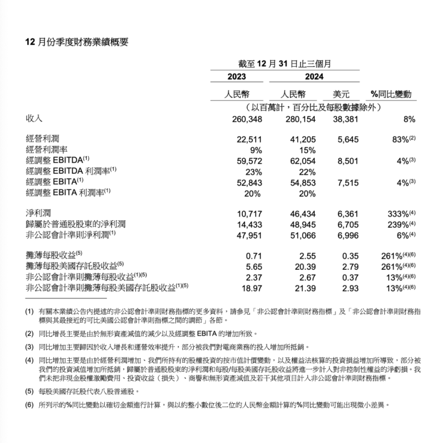 2月20日,在投资者们的“万众期待”中,阿里巴巴公布了2024年第四季度的财报,本季度营收为2801.54亿元,同比增长8%;净利润同比增长333%至464.34亿元。经营活动产生的现金流量净额为709.15亿元,同比增长10%。成绩单上,从营收到经营利润,再到净利润,全部超出市场预期。飘红的财报推动下,当晚,阿里美股大涨超8%。次日,阿里港股收于138.5港元,上涨14.56%,继续刷新3年以来的最高价。