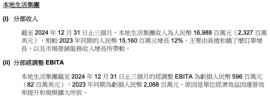 来自本地生活集团(LSG,主要包括饿了么和高德地图)的营收为169.88亿元(约合23.27亿美元),同比增长12%。但扣非净利润仍亏损5.96亿元。