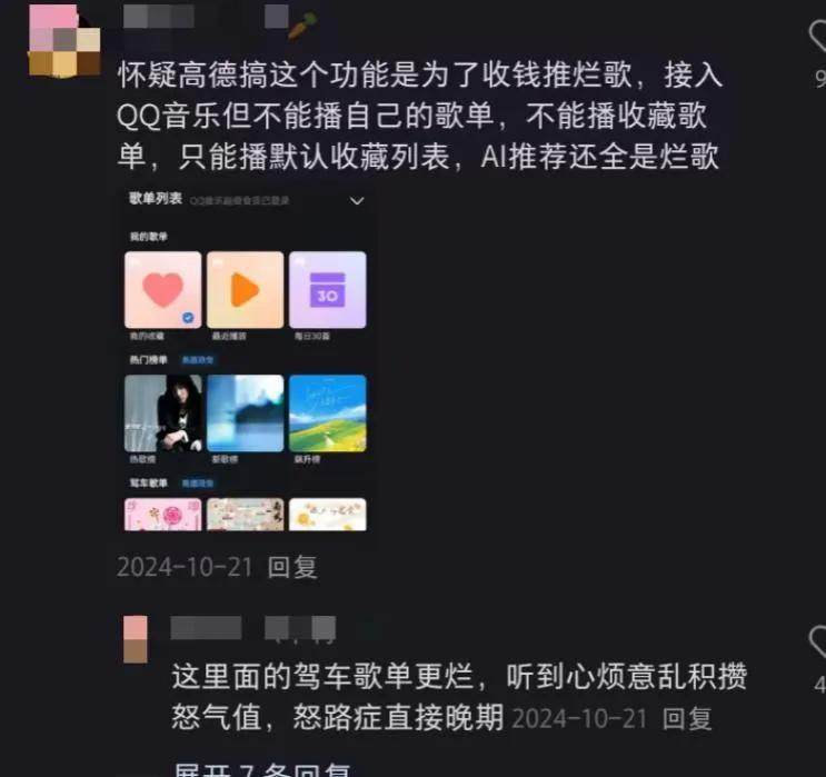 从平台动机,借此可以实现用户时长留存与收益分成。但也有用户在网络平台上说:高德地图推荐的歌单大多不好听,在高度集中精神开车过程中推荐的一些不好听的歌曲,容易引发个人的“路怒症”。