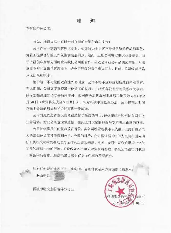 日前,前博乐达公关推广负责人、瑞志公司离职员工龙君在朋友圈发布了两份瑞志公司盖章公告。公告显示,上游供应商单方面终止合作导致供应链中断,员工最后工作日定于2月28日。