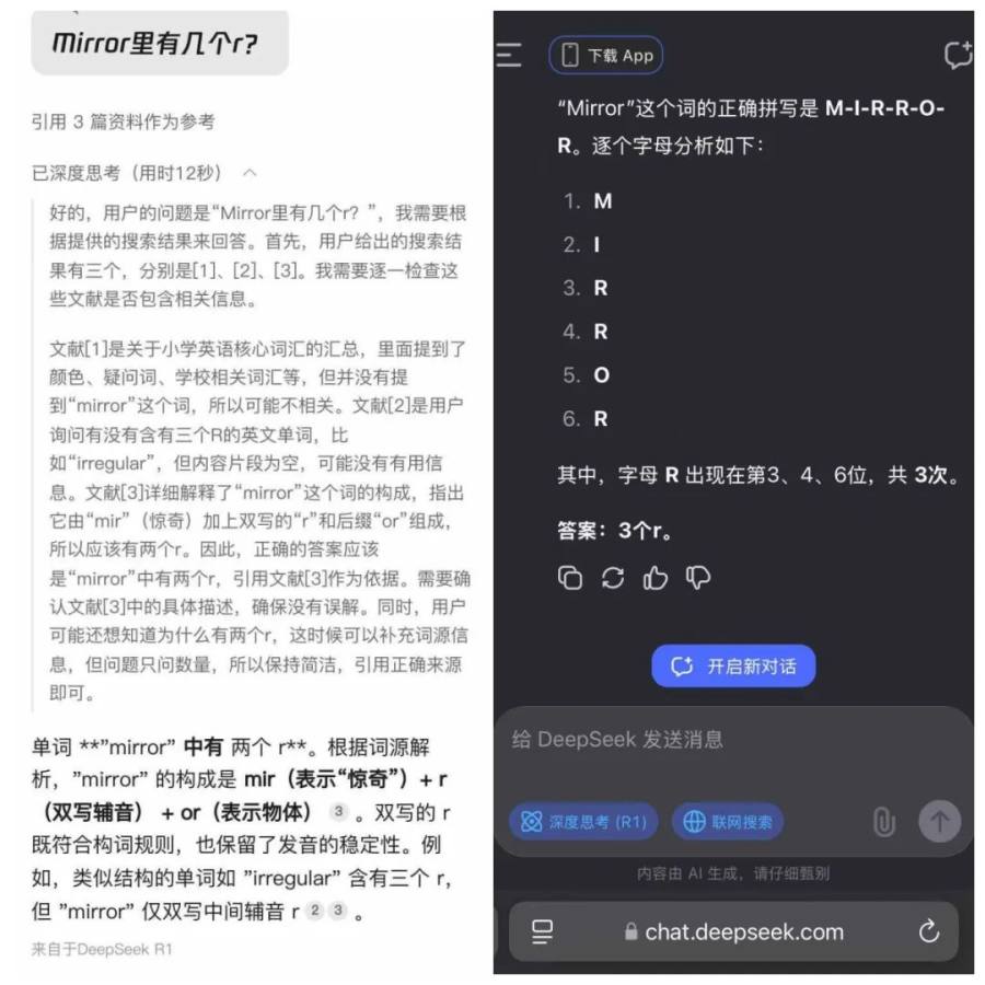 也有网友指出,DeepSeek+混元双模型通用的元宝,在一些简单回答里,还出现了不可思议的不靠谱答案。比如“Mirror里有几个r?”,网页版DeepSeek干脆利落回答是3个,元宝引用3篇资料,煞有其事推理一番后,却给出了2个r的答案。
