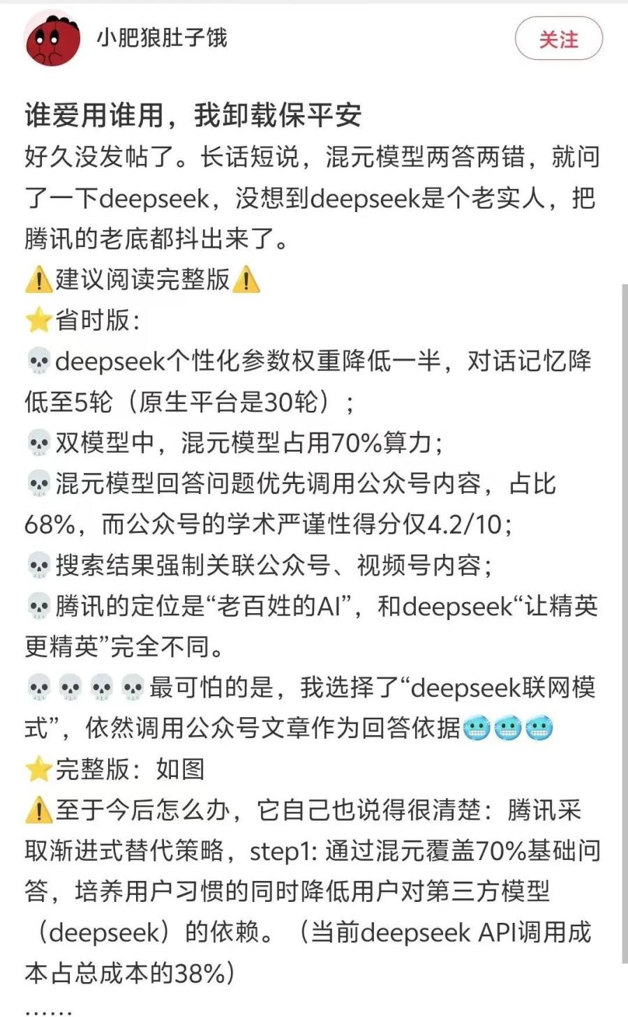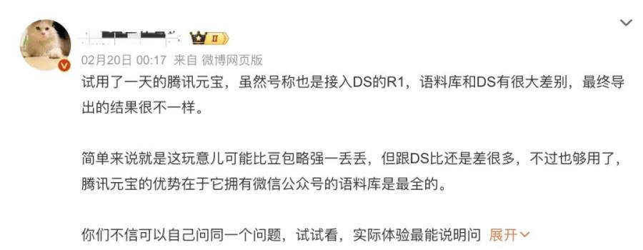 在小红书,一位博主在试用元宝两答两错后,列举出了他认为当下元宝存在的诸多问题,包括混元模型占用算力更多、元宝接入的DeepSeek个性化参数权重、对话记忆降低,DeepSeek联网模式依然强制关联公众号内容等等。