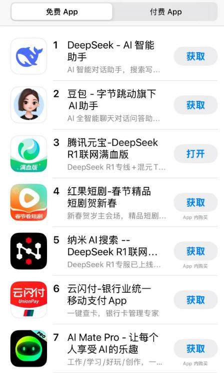 不过随着腾讯对DeepSeek的接入,这个局面发生了翻天覆地的改变,接入DeepSeek之后,元宝的下载量激增,目前在苹果App Store中已高居第二。