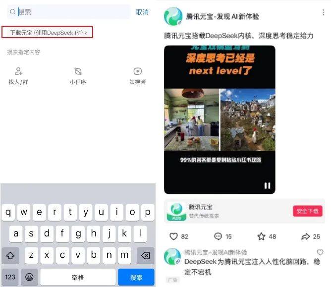 与此同时,各大厂商纷纷赶来蹭热度。其中,腾讯不遗余力,不但将微信搜索功能接入DeepSeek-R1,更是深化合作,让腾讯旗下首个AI原生APP——依托腾讯自研混元大模型的元宝,也能全面支持DeepSeek。