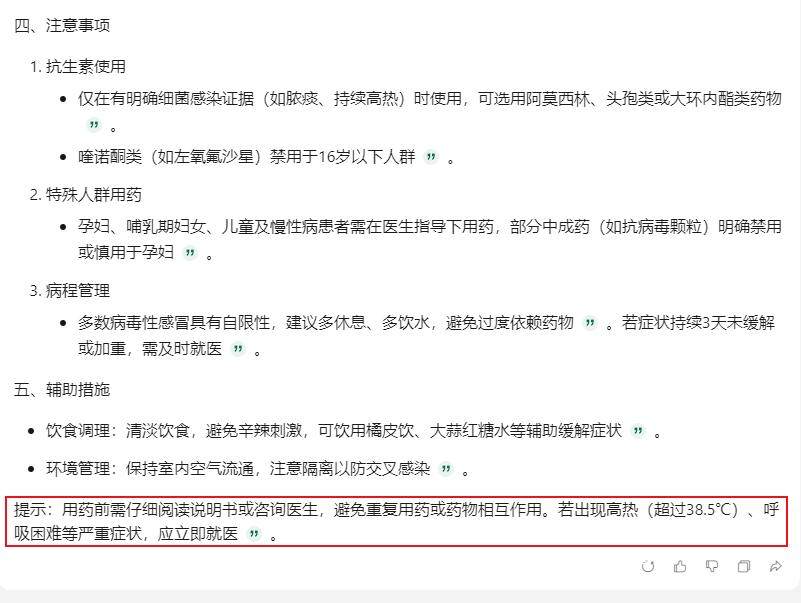 元宝自然也不例外。从前文中其实可以看到,由于信息来源不准确、生成逻辑存在漏洞等问题,元宝生成的内容可能会存在错误——元宝似乎也意识到了这一点,在回答医疗相关内容时进行了风险提示。