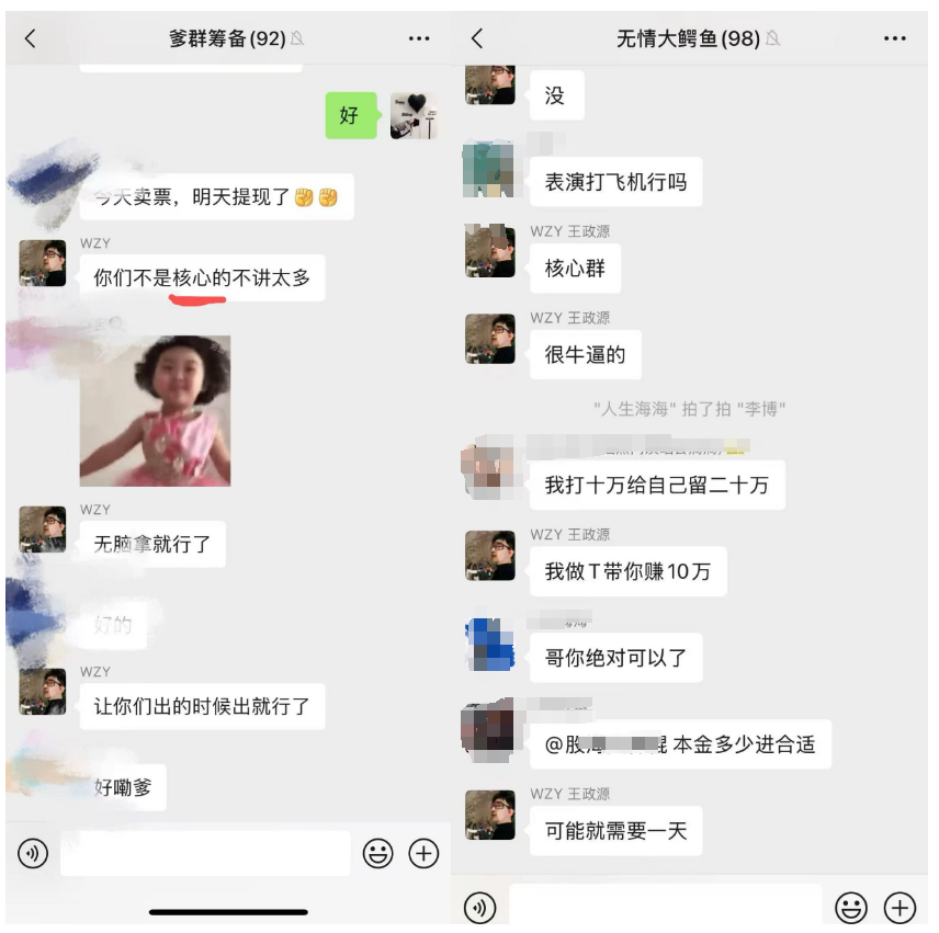 刘峰还提到,在那段时间里,王政源会在不同的群里推荐相同的股票,并告知群友他自己买了多少,鼓励大家增加仓位甚至融资购买。当时,刘峰为此投入了400多万元。