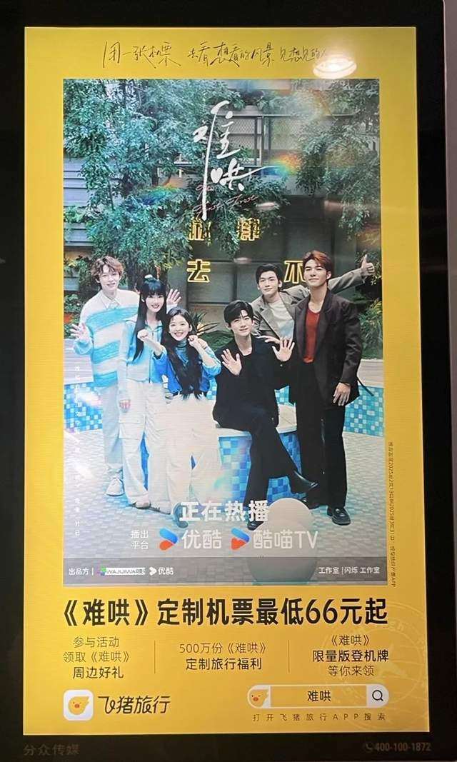 北京三元桥的某座办公楼的电梯间里,飞猪和《难哄》的定制机票就吸引了打工人的视线。午休时间,时不时就会出现等待灯牌,拍照扫码的人。在社交平台,“用一张机票,去看想看的风景见想见的人”成为了和异地恋高度共鸣的文案。
