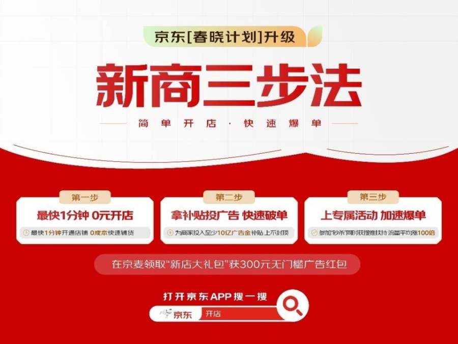 近日,京东宣布升级“春晓计划”,重磅推出“新商三步法”,包含“0元开店、拿补贴投广告、上专属活动”三大步骤,为新商家提供了简单、明确、有效的开店指南,新商家只需跟着步骤操作,即可快速起量、加速爆单。