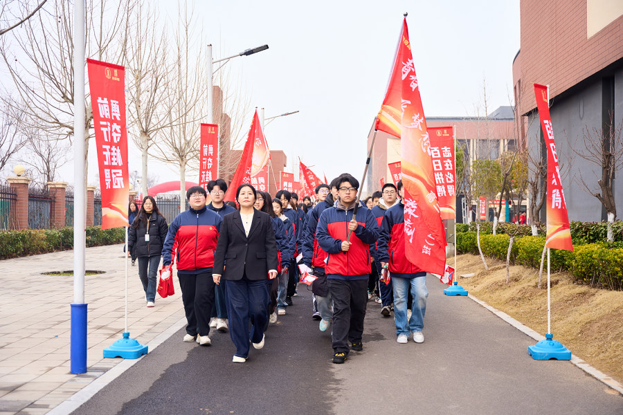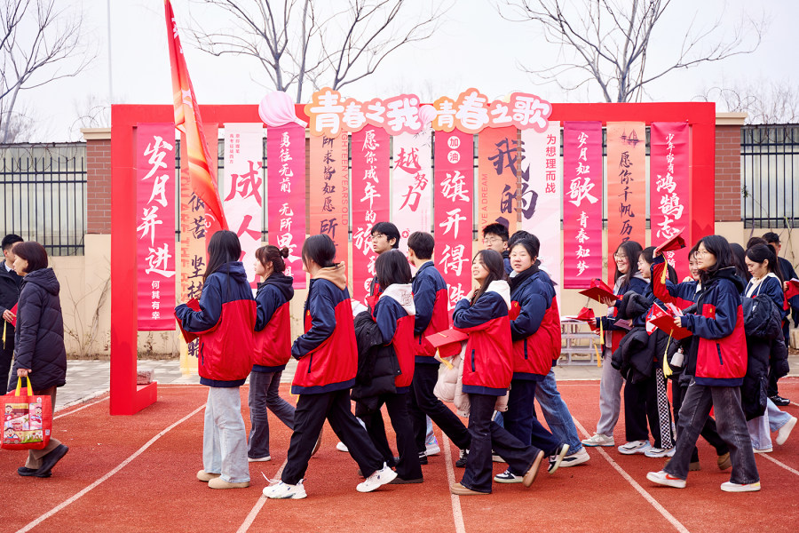 在学校领导班子、全体教师及家长们的夹道欢送中,高三学子整齐列队、高举班旗,昂首阔步在操场上稳步前行,依次跨过成人门、状元门。班级口号响彻云霄,气势磅礴,整个校园回荡着青春的热血与拼搏的激情。最后,同学们有序前往“时空信箱”,投递“写给100天后的自己”的一封信,为自己加油打气。