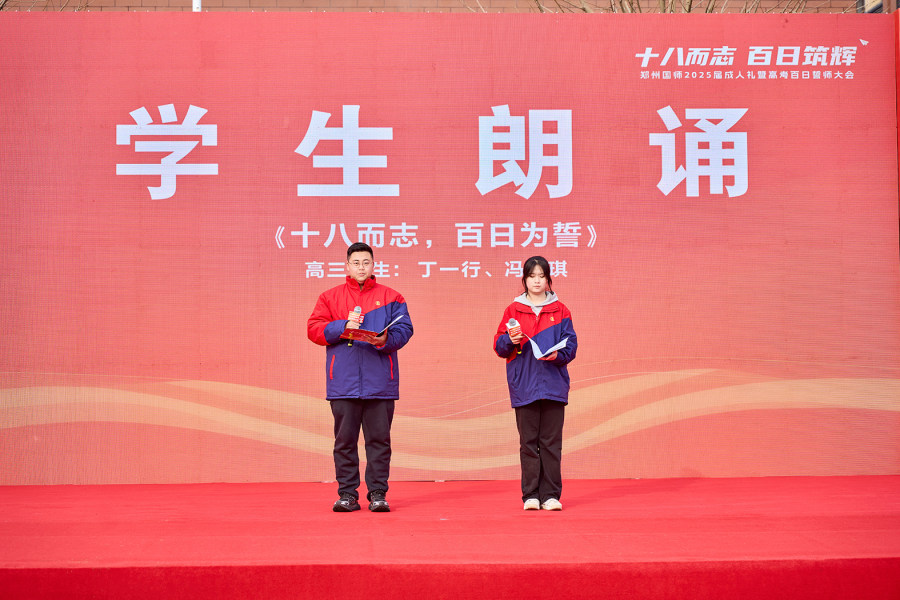 庄严的升旗仪式拉开活动序幕。全体师生肃立,目光坚定,以青春之名向祖国致敬。随后,高三学生丁一行、冯莘琪以《十八而至,百日为誓》为题带来诗朗诵,点燃全场斗志。