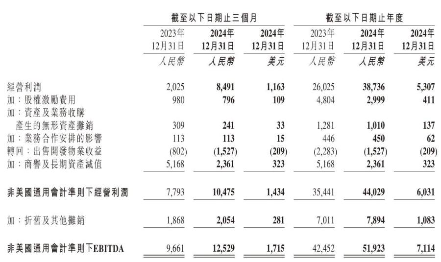 京东集团的利润端表现同样可圈可点,2024年合并经营利润总额为387.36亿元,增速接近50%;非美国通用会计准则(Non-GAAP)下的经营利润为440.29亿元,亦较2023年同期的354.41亿元增长24.2%。