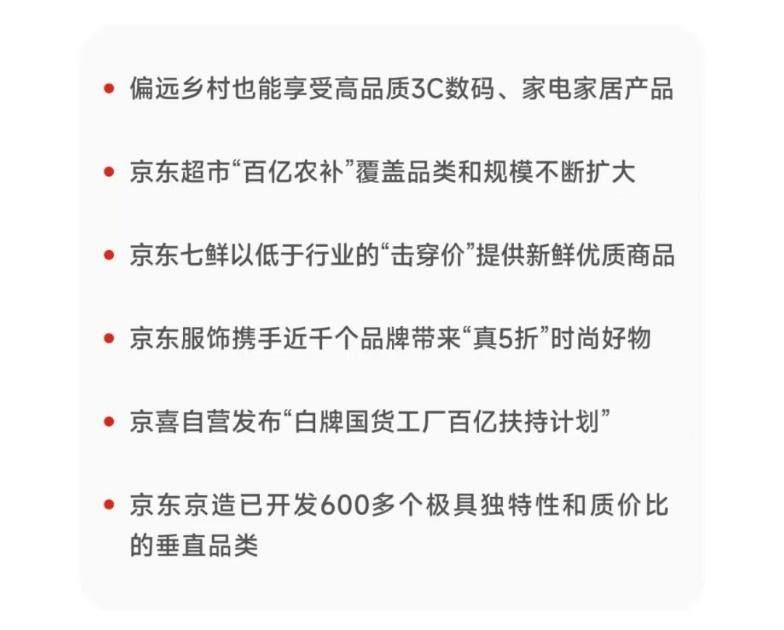 京东集团在财报中透露,京东采销聚焦“又好又便宜”原则,挖掘兼具高品质与性价比的产品。京东超市的“百亿农补”覆盖品类和规模不断扩大,京东京造为用户提供了超600个垂直品类,在生鲜、服饰等领域也有不小进展。