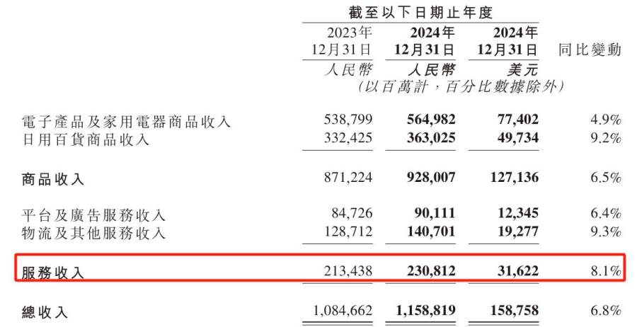 2024年,京东集团共计获得服务收入2308.12亿元,较2023年同期的2134.38亿元增长8.1%。其中,来自物流及其他服务的收入同比增长9.3%至1407.01亿元,平台及广告服务收入亦有所增长,来到901.11亿元。